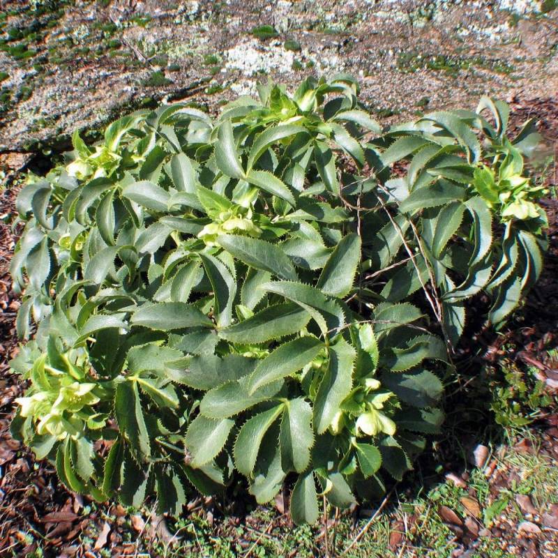 Feuillage persistant, vert foncé brillant et coriace. Hampes florales vert pâle en fin d'hiver dans les climats froids.