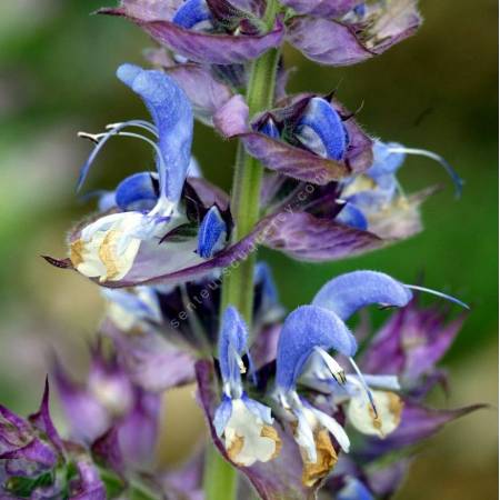 Plante au port étalé. Feuilles gris vert. Tige florale de 28 cm terminée par un épis de 3 à 5 cm de long. Calice pourpre très foncé. Fleur violette.