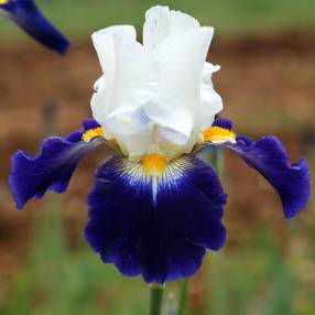 Contraste du blanc des pétales et du bleu nuit presque noir des sépales avec une barbe jaune d'or cernée par une petite plage blanche.