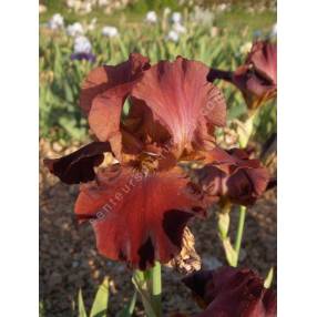 Rouge brun profond avec des pétales légèrement plus clairs et des sépales veloutés. Barbe bronze.
